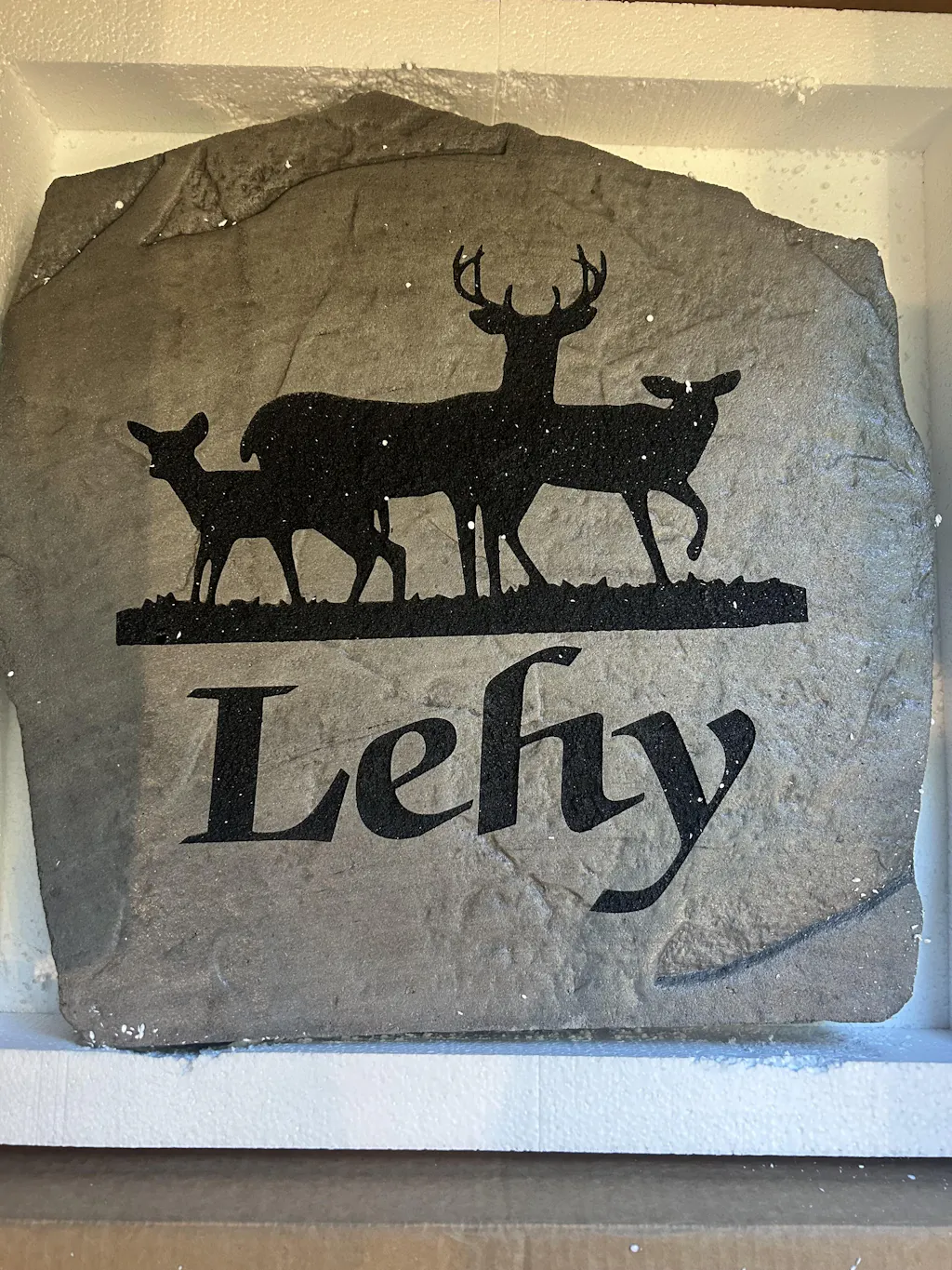Elevate your landscaping with a timeless Personalized Garden Stone that shines a spotlight on your family name and love for the outdoors. Perfect for your home or hunting cabin, our Deer Name Stone is beautifully crafted and made to order to ensure every letter stroke, calligraphy swirl and flourish adds flawless sophistication to your unique home landscape. Your full last name will be framed and engraved across the center of the landscape stone with crisp black lettering. With Design A Stone, you can create a family name feature that looks and feels like home.