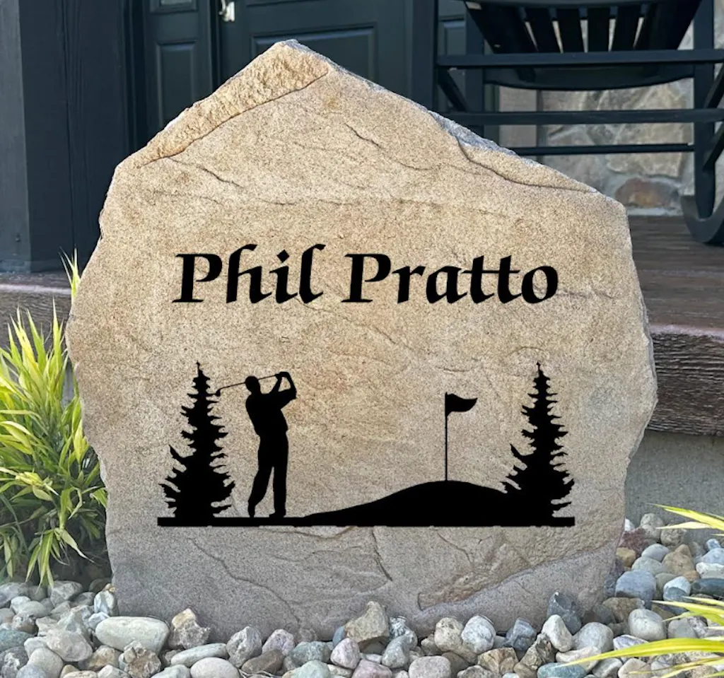The Golf Name Stone is a perfect way to welcome family, friends and guests and show off your favorite hobby. Designed with a crisp, clear font that is easy to read, this garden stone adds simple sophistication and elegance to your landscape. Personalize the landscape stone design with your family name – we’ll craft it for you and ship it within 4 business days! We engrave the address directly into the surface of our textured, realistic stone, and finish with a weatherproof sealant so it will last a lifetime.