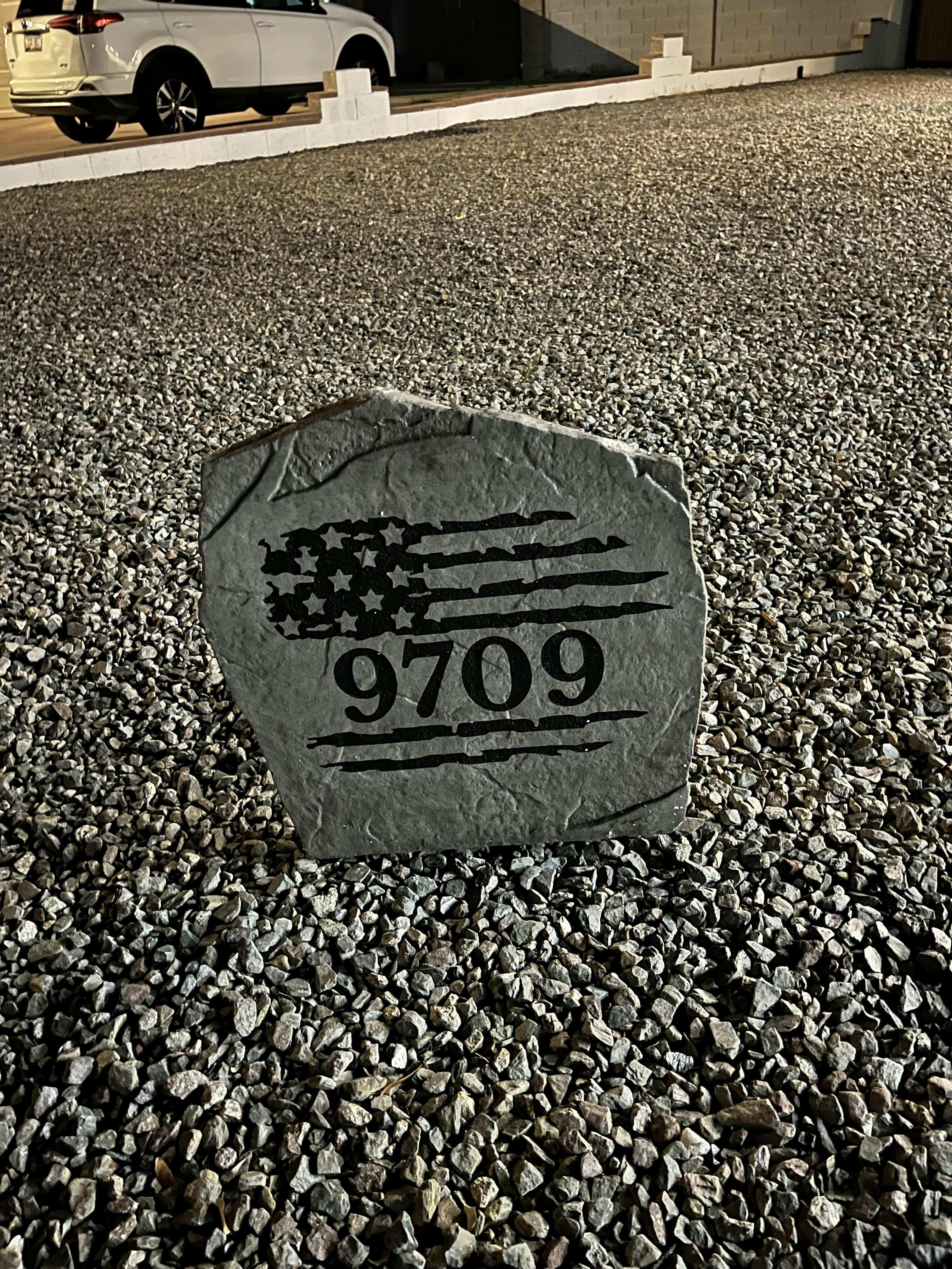 Rustic outdoor stone featuring USA flag design and custom text